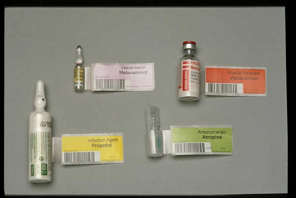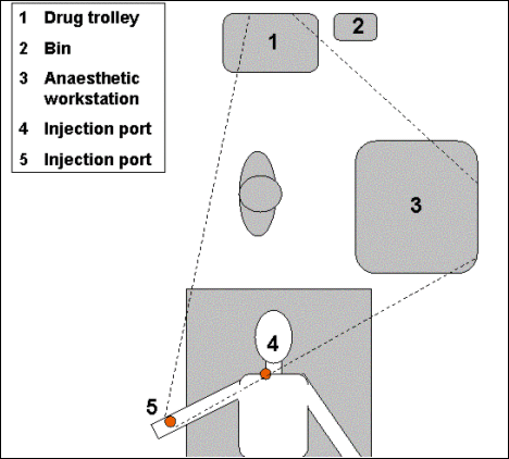 As illustrated in Figure 1, during an operation an anaesthetist spends most of their time within a triangular area defined by one or more drug trolleys, an anaesthetic workstation and the patient. Injectable drugs, some in ampoules and some in pre-filled syringes, are stored in the drug trolley. Under the IDAS system, the ampoules and syringes have a label attached showing the drug’s class, name, and a barcode representing the Drug Identification Number (DIN). As shown in Figure 2, the label is also colour-coded based on the drug’s class according to an international standard (Standards New Zealand, 1996). The top of the drug trolley is used as a work surface, on which the anaesthetist prepares injectable drugs for the operation. Drugs kept in ampoules are ‘drawn up’ into syringes, which then have a corresponding barcode label attached. Under the IDAS system, plastic trays are used to keep the drug trolley drawers and work surface organised. An example of the trays used on the work surface is shown in Figure 3.